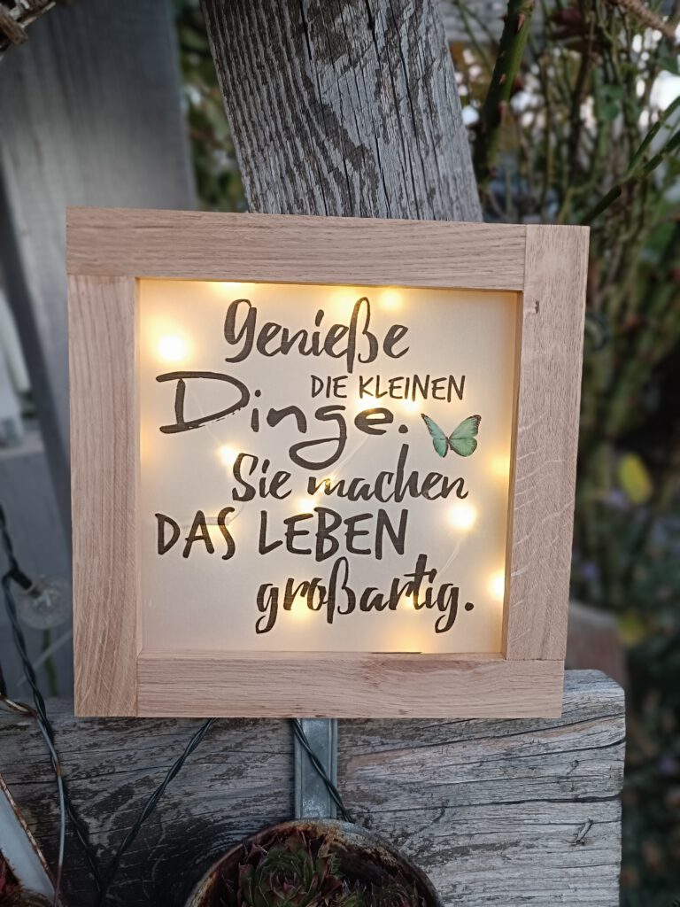 Lichtboxen geklebt aus Eichenholz. 18,3cm breit und hoch. Tiefe: 4cm. Von hinten wird eine Drahtlichterkette mit Timerfunktion ins Innere geschoben. Preis: 15€ / Fotos mit oder ohne zusätzlichen Text sind möglich. – individuelle Textgestaltung jederzeit möglich. Ich erstelle ein Layout und verschiedene Schriftbilder zur Auswahl.