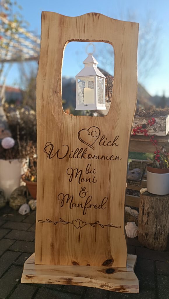 Alle Texte die auf den großen Aufstellern vorhanden sind, können auch auf kleine Schilder gebracht werden. Dies auch wahlweise mit Lichterkette.
